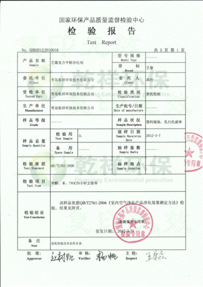 ->艺馨复合甲醛净化剂-国家权威检测报告