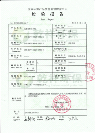 艺馨除醛纳米蜡-国家权威检测报告